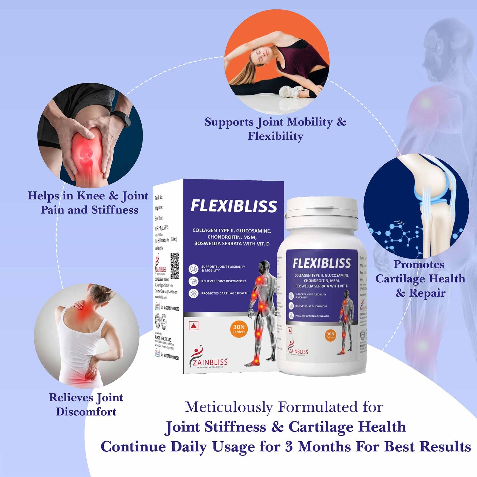 Flexibliss is an effective formula that take care of your joints, enhance their flexibility, and promote overall joint health. This advanced blend of Collagen Type-II, Glucosamine, Chondroitin, MSM, Boswellia Serrata with Vitamin C & D rejuvenates and nourishes cartilage and joints, restores crucial nutrients and optimal hydration for enhanced mobility and strength.